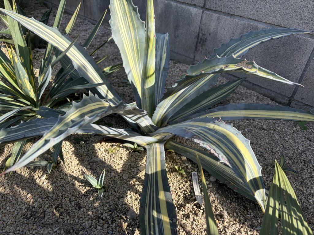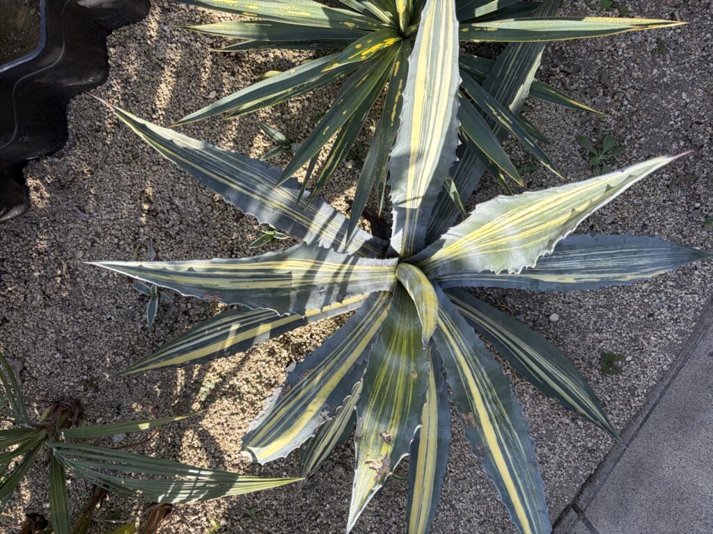 2025.07.19 2025.12.14 アガベ PR アガベ アメリカーナ 黄縞斑 G-Jumper 記事内に商品プロモーションを含む場合があります Google アガベ アメリカーナ 黄縞斑Agave Americana cv.striata 特徴と購入経緯 メルカリで細い縞斑の物を買ったのですが、やっぱり違う。コレジャナイ感が凄かったです。ヤフオクで斑がハッキリとした株に買い直しました。縞斑はガラに妥協しない方が良いと思います。 地植え成長記録 成長記録 24年4月 記録なし25年7月 記録なし25年12月 幅90cm、高さ44cm、葉幅8cm 24年4月購入時 ハッキリした斑が太く入って、綺麗なガラになっています。もう一度言わせて下さい。ガラに妥協しない方が良いです。 25年7月1年3カ月経過 綺麗なガラは維持されていて、成長も早いです。縞斑からはいろんな斑の子株が出ると聞いていましたが、うちの子も中斑だったり、縞斑だったり、色々出してくれそうです。 25年12月1年8カ月経過 写真が下手くそですね。虫に食べられていますが、順調に育っています。 幅90cm、高さ44cm、葉幅8cm 参考、コレジャナイ感の縞斑 比べるとコレジャナイ感ありませんか? にほんブログ村 アガベ一覧に戻る HOMEに戻る Xからの読者コメントをお待ちしています。ブログ更新の励みになります! Xでコメントする #アガベ#アメリカーナ#地植え#成長記録#斑入り#縞斑 Google