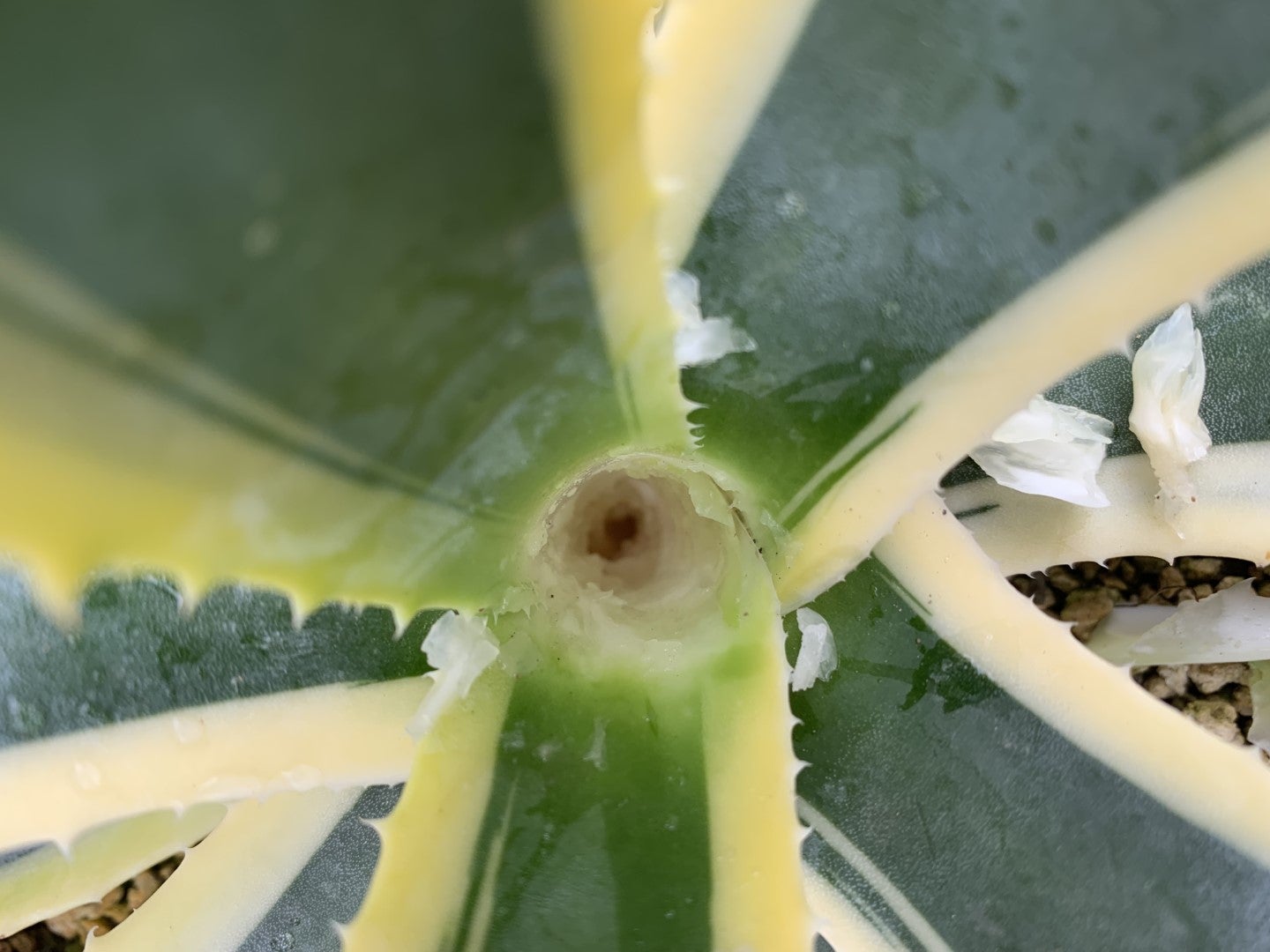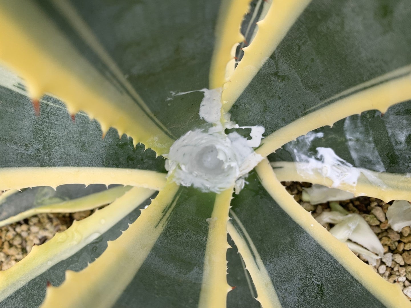 雨除けが不十分だったアメリカーナ白縞斑。芯止めでくり抜いた所が腐ってしまい、ダコニールを何度も塗り、なんとか星にならずに済みました。