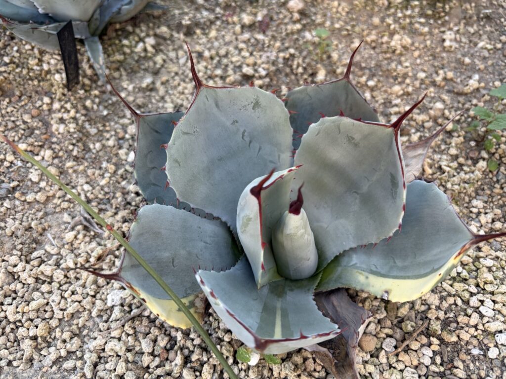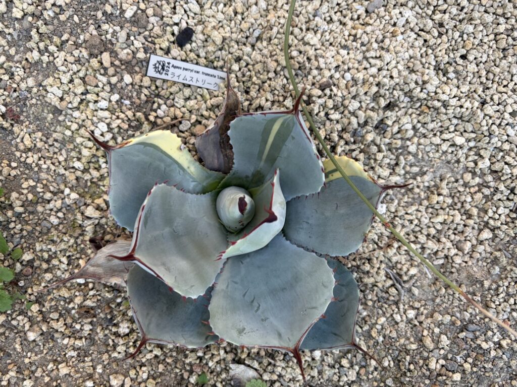 2025.08.10 2025.12.29 アガベ PR アガベ トランカータ ライムストリーク G-Jumper 記事内に商品プロモーションを含む場合があります Google アガベ ほぼトランカータ ライムストリークAgave Parryi var. truncata ‘Lime Streak’ 特徴と購入経緯 トランカータの覆輪斑入りのライムストリーク。アガベに興味を持った時には2万円位していましたが、1年後くらいにNsさんの所で1万円でいいよって事で購入させて頂きました。でも、今はメリクロン株が出て、3000円位で購入できるようです。Nsさんから普通のライムストリークより、斑が少ないけど、特徴的な株の方が楽しいよってオススメして頂きました。 地植え成長記録 成長記録 24年4月 Nsから購入25年8月 記録なし25年12月 横17cm 高さ10cm 葉幅7cm 24年4月購入時 普通のライムストリークもありましたが、半分くらいはトランカータのライムストリークを購入させて貰いました。 25年8月1年4カ月経過 半分以上等いうか、殆どがトランカータになってしまったライムストリーク。トランカータにならない様に祈るだけです。 25年12月1年8カ月経過 更にトランカータに近づく。他のトランカータと同様に下葉やられて大きくなっていない。来年からは雨が掛からない様にします。 横17cm 高さ10cm 葉幅7cm にほんブログ村 この記事にご興味を持っていただいたら 地植え出来るアガベの品種毎の成長記録は、コチラから 是非!! アガベの育成のポイントは、コチラから 是非!! 別のカテゴリもご興味があれば見て下さい。 <アガベ・ユッカ> 群馬の平地でズボラ管理している成長記録です。<投資・ブログ収益> ズボラな私が始めた投資とブログの記録です。<家メンテ・修理> 家のメンテナンスや家電等の修理の記録です。<DIY・家庭菜園> DIYで作った物の紹介やズボラ管理の家庭菜園テキストをクリック!! HOMEに戻る Xからの読者コメントをお待ちしています。ブログ更新の励みになります! Xでコメントする #アガベ#パリー#地植え#成長記録#斑入り#覆輪 Google