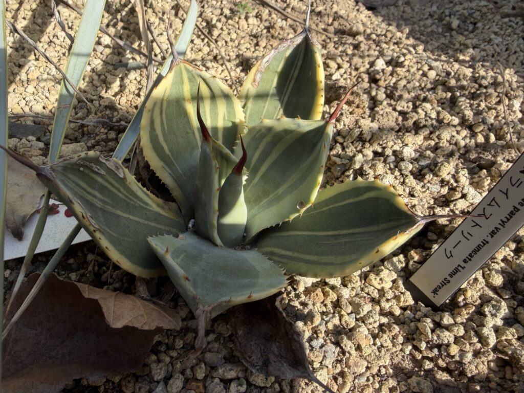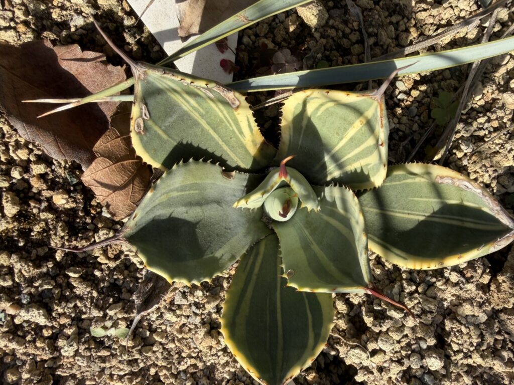 2025.08.10 2025.12.14 アガベ PR アガベ トランカータ ライムストリーク G-Jumper 記事内に商品プロモーションを含む場合があります Google アガベ トランカータ ライムストリークAgave Parryi var. truncata ‘Lime Streak’ 特徴と購入経緯 トランカータの覆輪斑入りのライムストリーク。Nsさんから購入させて頂いた斑が少ない特徴的な株。やっぱり普通のライムストリークも欲しくなり、師匠から譲って頂きました。 地植え成長記録 成長記録 24年9月 師匠から譲って貰う25年8月 記録なし25年12月 幅15cm 高さ5cm 葉幅4cm 24年9月購入時 ちょっと傷ついていますが、格安で譲って頂きました。 25年8月11カ月経過 地植えしても、あまり大きくならないですね。下葉もやられてしまい、大きくなるのは時間が掛かりそう。 25年12月1年3カ月経過 下葉がすぐにやられてしまい、大きくなりません。来年の春には、ビニールトンネルエリアに移そうと思います。 幅15cm 高さ5cm 葉幅4cm にほんブログ村 アガベ一覧に戻る HOMEに戻る Xからの読者コメントをお待ちしています。ブログ更新の励みになります! Xでコメントする #アガベ#パリー#地植え#成長記録#斑入り#覆輪 Google