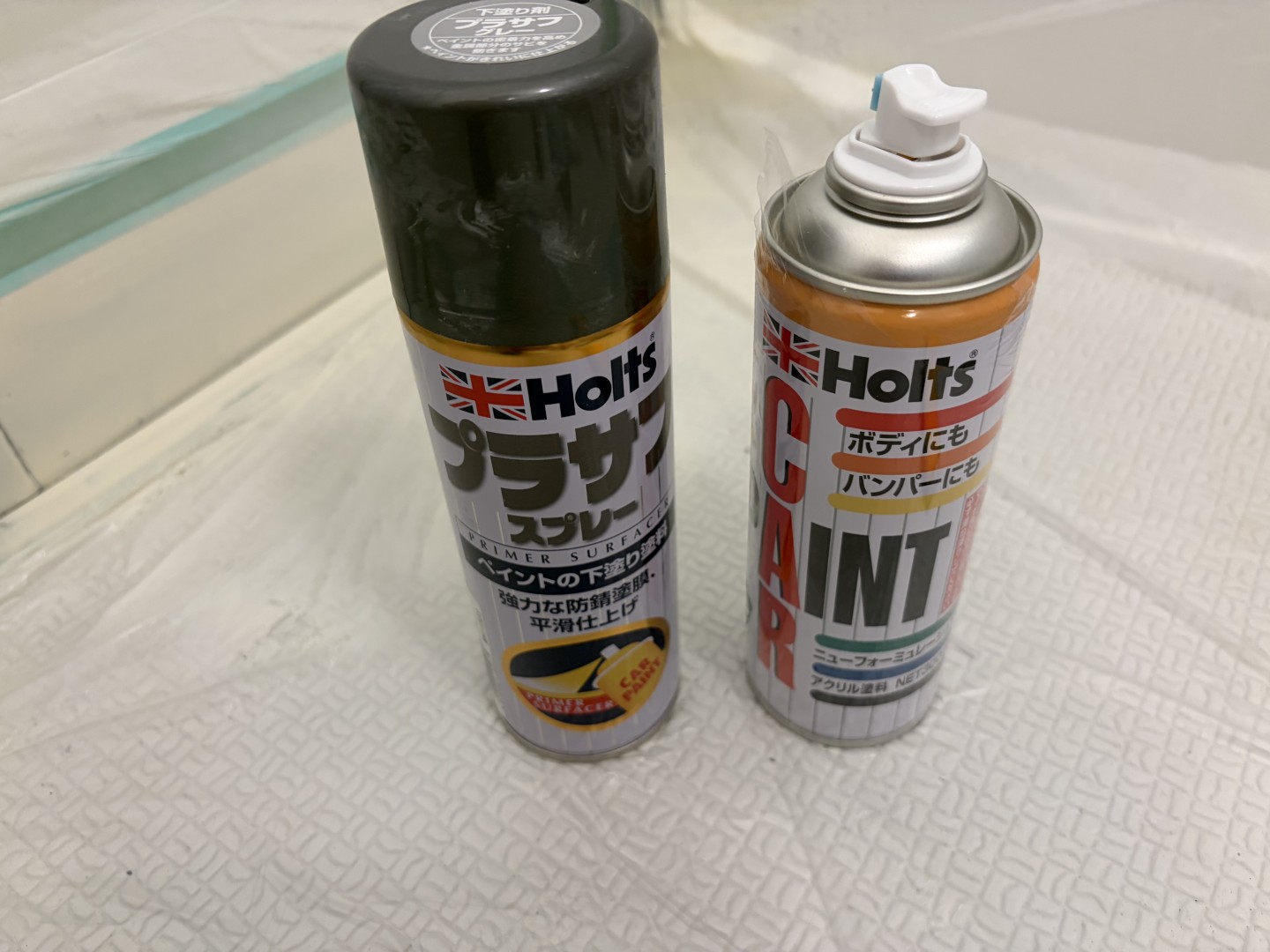 プラサフ(プライマー・サーフェーサ)と塗料です。プラサフには防錆効果もあるって書いてありました。