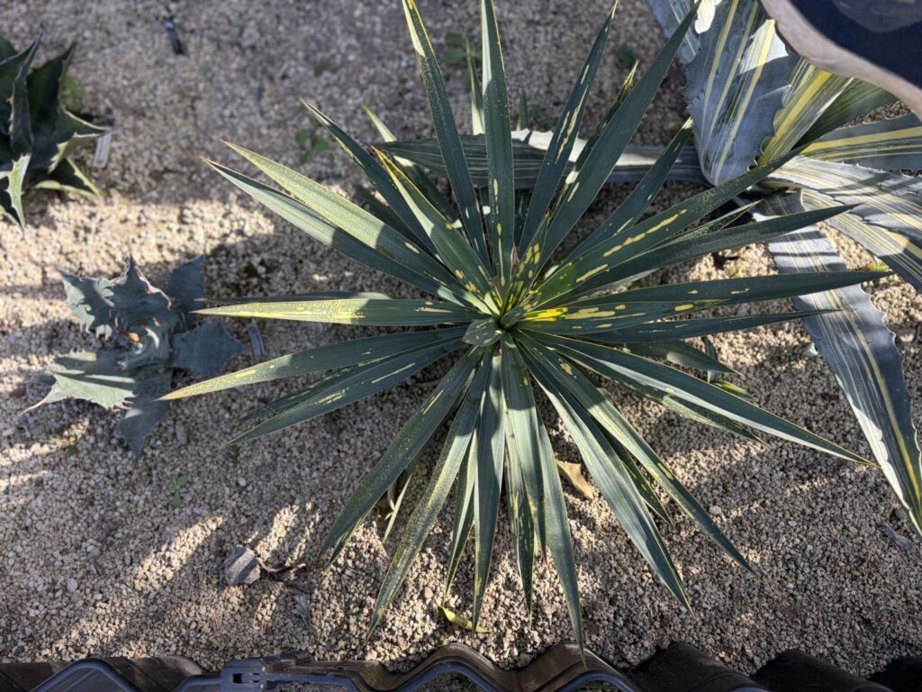2025.07.22 2025.12.14 ユッカ PR ユッカ グロリオサ 散斑 G-Jumper 記事内に商品プロモーションを含む場合があります Google ユッカ グロリオサ 散斑Yucca Gloriosa speckled variegation 特徴と購入経緯 師匠がインスタに上げていたグロリオサの散斑、とても綺麗だったので、購入させて頂きました。ユッカが植え替えに弱いのだと思うのですが、ブライトエッジも、これも瀕死の所まで、行きました。でも、それを乗り越えたら、綺麗な散り斑を出してくれました。 地植え成長記録 成長記録 24年7月 師匠から購入24年9月 瀕死の状態になる25年7月 記録なし25年12月 幅58cm 高さ29cm 葉幅2.5cm 24年7月購入時 購入時、散り斑が凄そうな予感。 24年9月2か月経過 どんどん枯れて行き、瀕死の状態まで行きました。 25年7月1年経過 株もしっかりとして、とても綺麗なガラを出してくるようになりました。良い感じ 25年12月1年5カ月経過 凄かった散り斑がだいぶ落ち着いてしまいました。夏から秋にかけては、殆ど斑が入らなかったので、季節性があるのかな?確認していきます。 幅58cm 高さ29cm 葉幅2.5cm にほんブログ村 この記事にご興味を持っていただいたら 地植え出来るユッカの品種毎の成長記録は、コチラから 是非!! 別のカテゴリもご興味があれば見て下さい。 <アガベ・ユッカ> 群馬の平地でズボラ管理している成長記録です。<投資・ブログ収益> ズボラな私が始めた投資とブログの記録です。<家メンテ・修理> 家のメンテナンスや家電等の修理の記録です。<DIY・家庭菜園> DIYで作った物の紹介やズボラ管理の家庭菜園テキストをクリック!! Xからの読者コメントをお待ちしています。ブログ更新の励みになります! Xでコメントする #グロリオサ#ユッカ#地植え#成長記録#斑入り Google